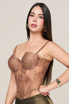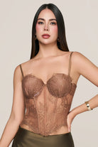 Este corset en tono tierra combina sensualidad y estructura con un diseño en encaje y varillas que define la cintura y realza la silueta con elegancia. Su espalda con amarre ajustable permite moldear la figura a tu medida, mientras el tono cálido evoca la armonía de la naturaleza.