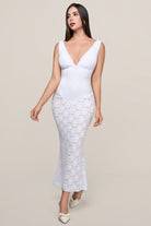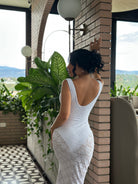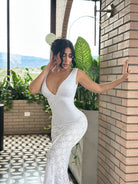 Este vestido largo en tono marfil evoca la pureza de los pétalos al amanecer. Su diseño con escote profundo y silueta ceñida realza tu figura con elegancia natural, mientras su textura delicada aporta un brillo sutil y etéreo.
