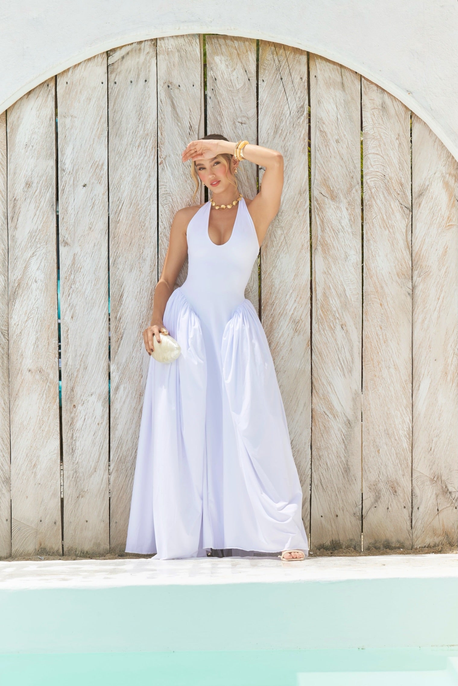 El escote profundo en V con detalle de ajuste en el cuello lo hacen ideal para un look delicado pero con soporte. La caída de su falda le da un acabado sofisticado, ideal para eventos de día como bodas en la playa, celebraciones al aire libre o sesiones fotográficas.