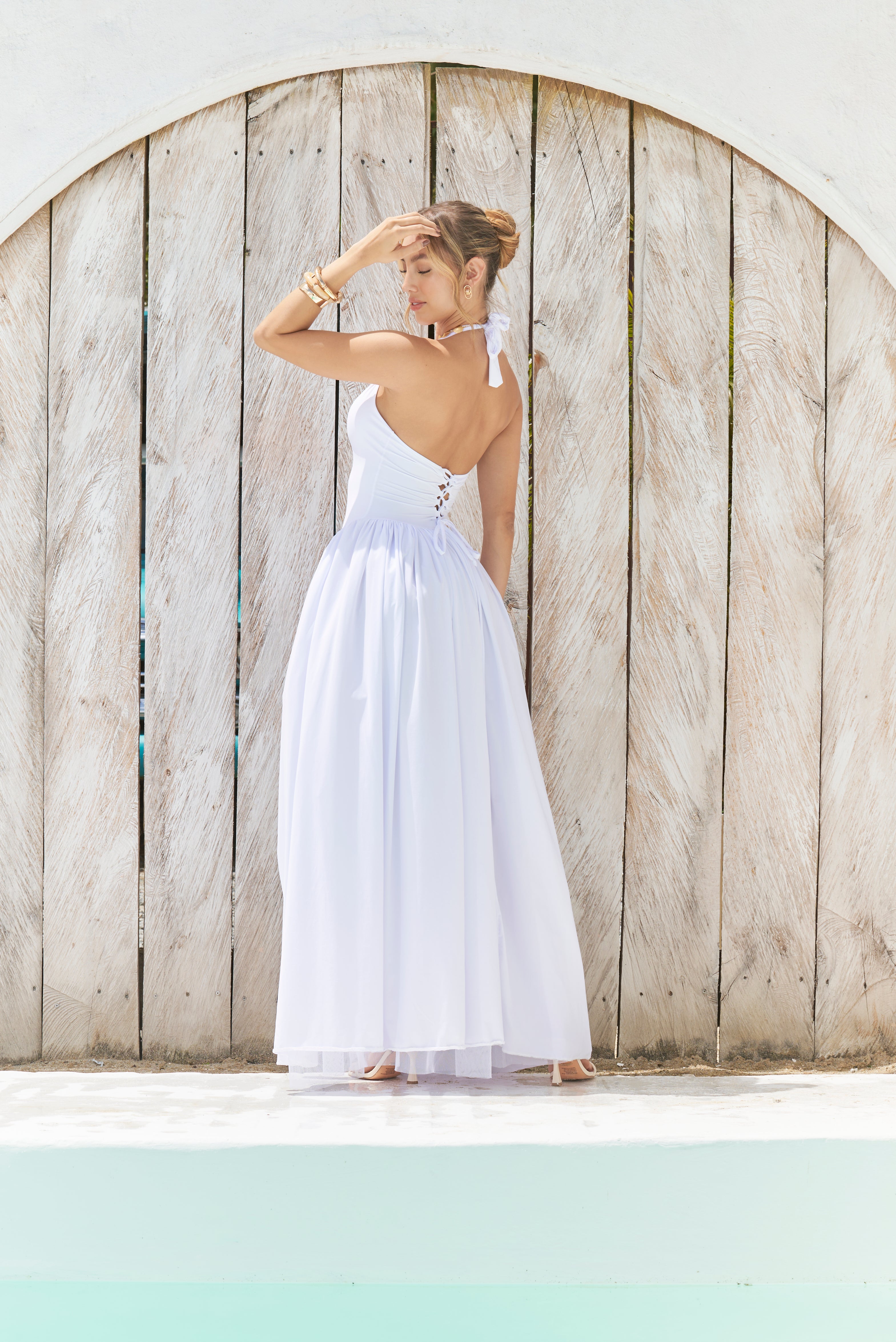 Romántico, fresco y ultra femenino, este vestido largo color blanco es perfecto para ocasiones especiales en climas cálidos. Su diseño ajustado al cuerpo resalta la silueta con delicadeza, mientras que la faja interna oculta moldea la figura y proporciona una sensación de firmeza y confort.