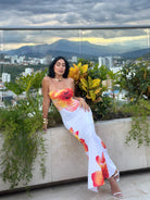 Clásico, elegante y atemporal , este vestido de combina un diseño minimalista con un toque moderno gracias a su base en color blanco y estampado de flores turquesa que estilizan visualmente la silueta, creando un efecto de definición y armonía, incluye faja interna que ayuda a hormar y estilizar tu cuerpo.